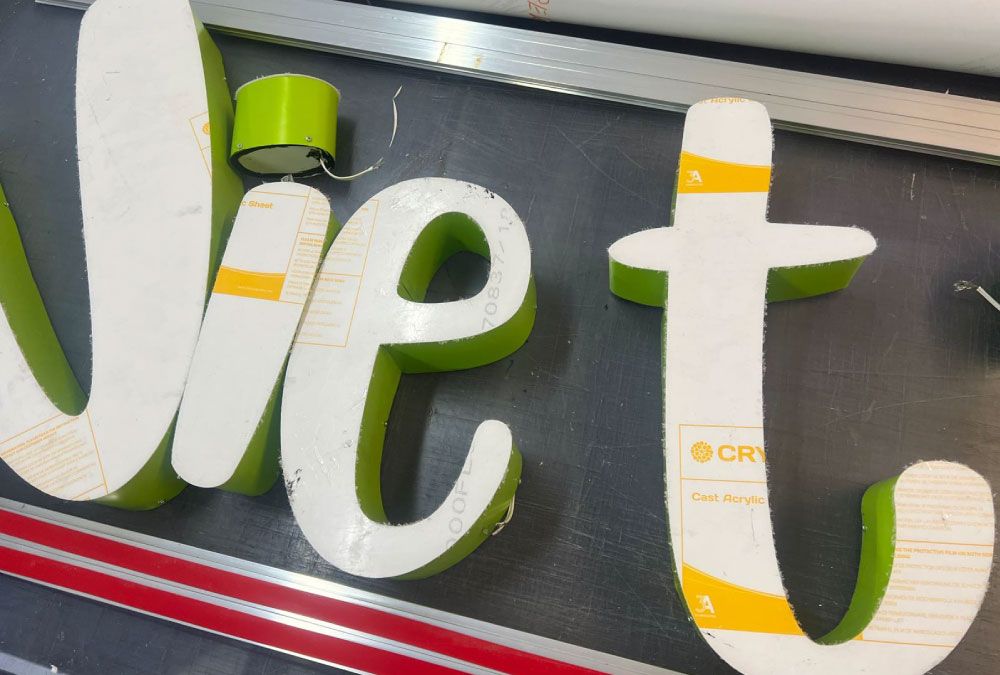 This particular Sign is made up of 3D White Face Lit Letters with Lime Green Aluminium Sides and attached to a Rich Green Auuminium Composite Material Lightbox with smaller text illuminated from inside white and green Dots.